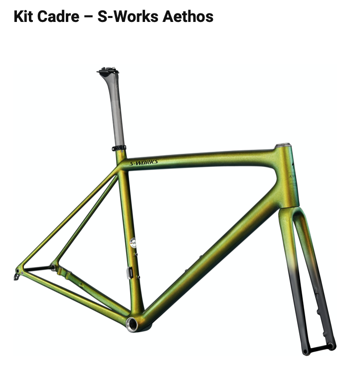 Les modèles Aethos Pro & Expert sont conçus autour de notre carbone FACT 10r au lieu du carbone FACT 12r sur les modèles S-Works. Cela signifie une différence de poids du cadre de 114 grammes (699 gr contre 585 gr en taille 56 cm dans son coloris le plus léger.)